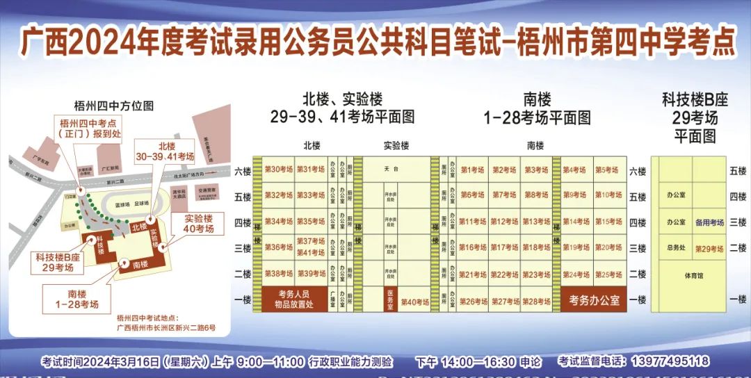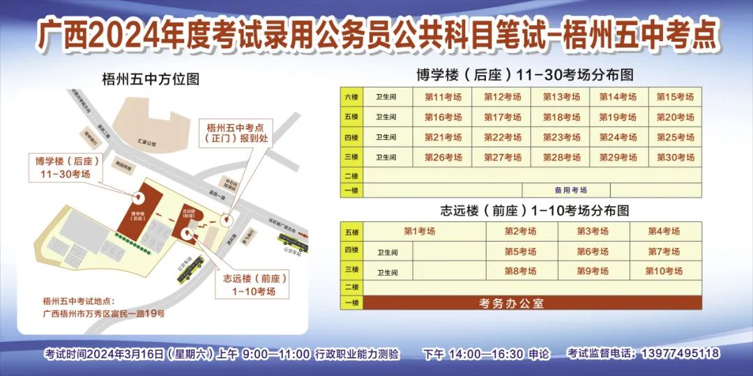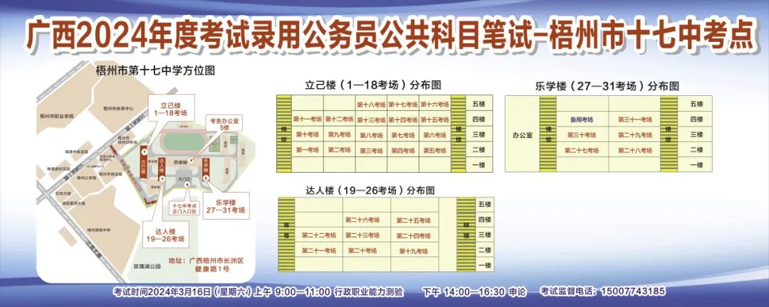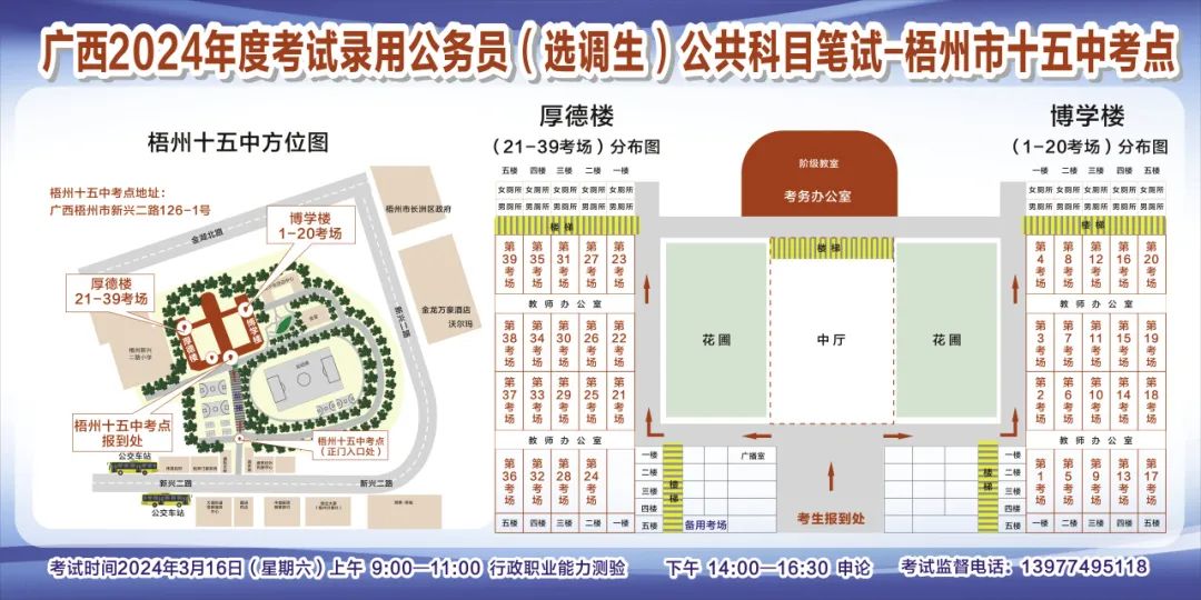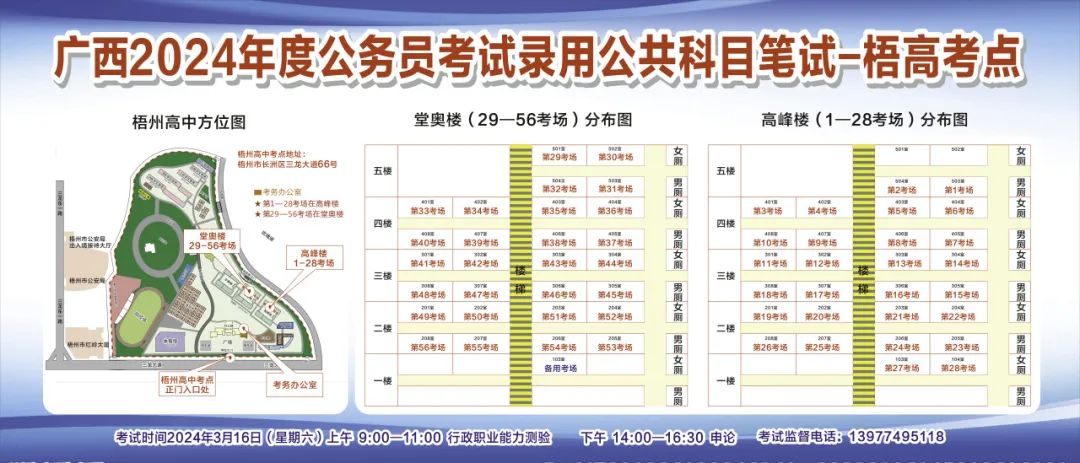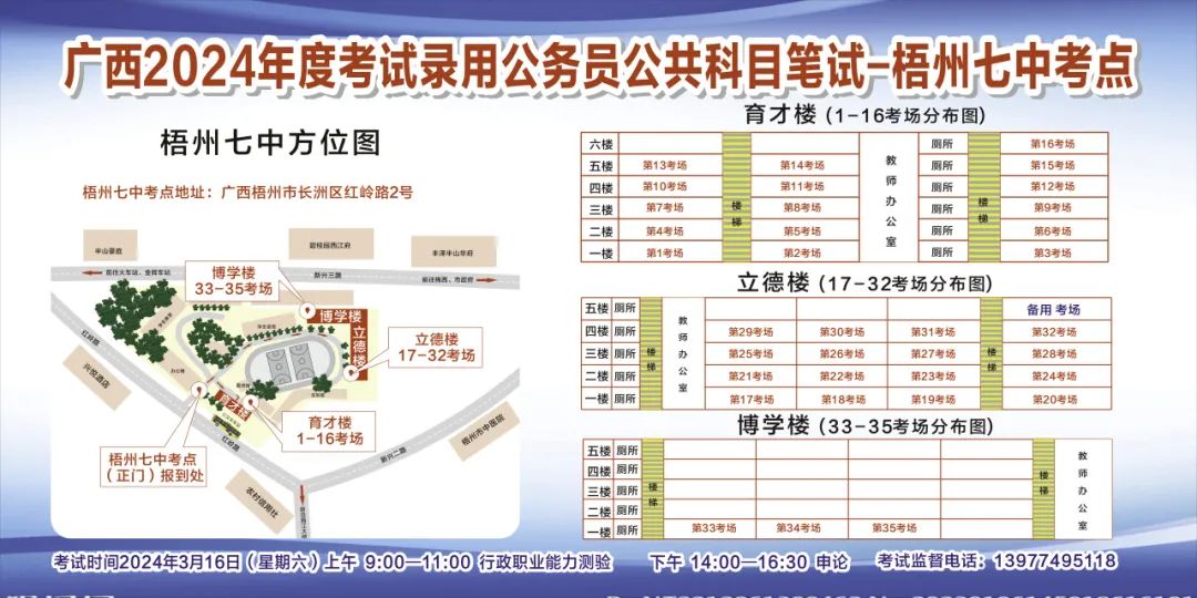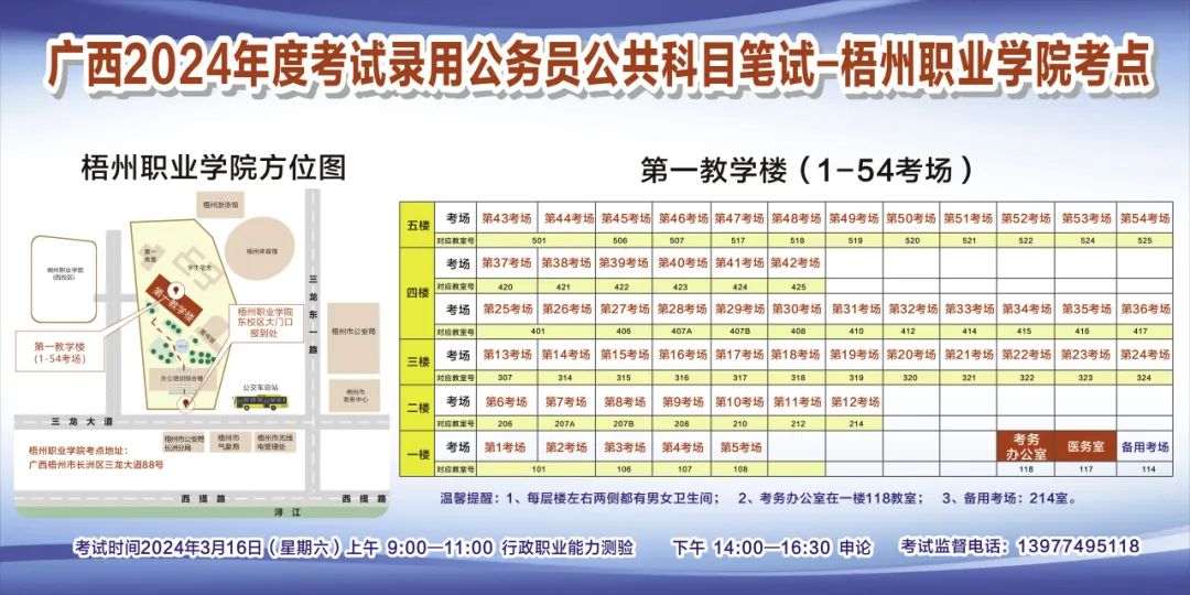 一、廣西2024年度考試錄用公務(wù)員(選調(diào)生)公共科目筆試將于3月16日舉行,梧州考區(qū)共設(shè)置9個考點,請考生提前熟悉各自考點位置、周邊環(huán)境及交通情況,考試當(dāng)天提前出門做好準(zhǔn)備,準(zhǔn)時參加考試。特別提示:因考點停車場地有限,所有考生車輛不得進(jìn)入考點,請考生規(guī)劃好前往考點的交通方式和路線。