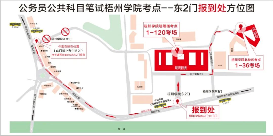 公交車參考:乘坐10路、32路、49路、49路延長線、蒼梧城鄉(xiāng)6路到梧州學(xué)院體育館站,下車后步行約200米到達(dá)梧州學(xué)院東大門。考生統(tǒng)一在梧州學(xué)院東大門進(jìn)入,考點門口處于交通干道,送考車輛只能在東門外短暫停留,梧州學(xué)院南門及其他門無法核驗考生身份。從東大門進(jìn)入明理教學(xué)樓考點考場步行約5分鐘,進(jìn)入北校區(qū)教學(xué)樓考點考場步行約15分鐘,請規(guī)劃好進(jìn)入考點時間。