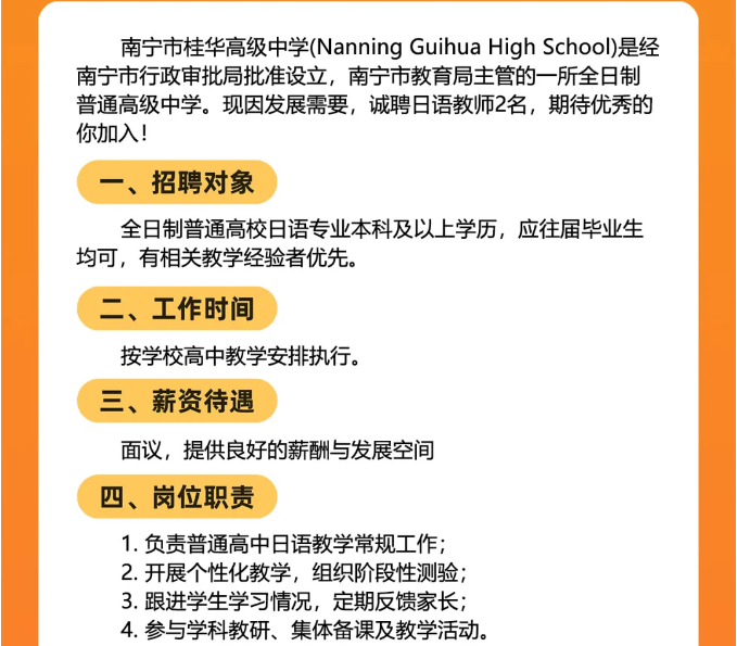 原文標(biāo)題:南寧市桂華高級中學(xué)面向社會公開招聘2名日語老師的公告