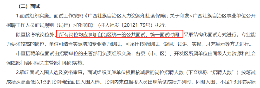 還剩下廣西區(qū)直單位(招錄1535人)的大部分面試資審名單尚未發(fā)布,不過(guò)這兩天各個(gè)區(qū)直單位應(yīng)該也會(huì)發(fā)完了。廣西各地市是什么時(shí)候面試?大概、也許、廣西地市也是6月14、15日面試哦,由區(qū)直事業(yè)單位、南寧事業(yè)單位等招錄公告可知“面試采取公共結(jié)構(gòu)化面試方式進(jìn)行,自治區(qū)統(tǒng)一公共結(jié)構(gòu)化面試時(shí)間”,事業(yè)單位大部分都是結(jié)構(gòu)化面試,而根據(jù)下方網(wǎng)傳圖片(面試時(shí)間定于6月14、15日),今年各地市可能真的統(tǒng)一面試時(shí)間,我們拭目以待: