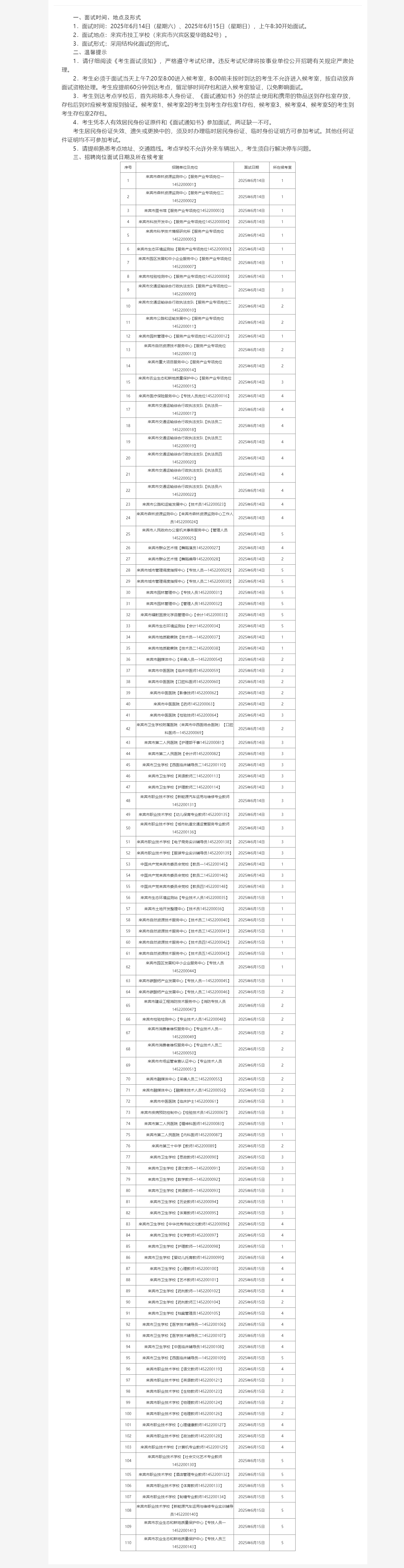來(lái)賓市2025年市直事業(yè)單位公開(kāi)招聘人員面試招聘崗位所在候考室和溫馨提示
