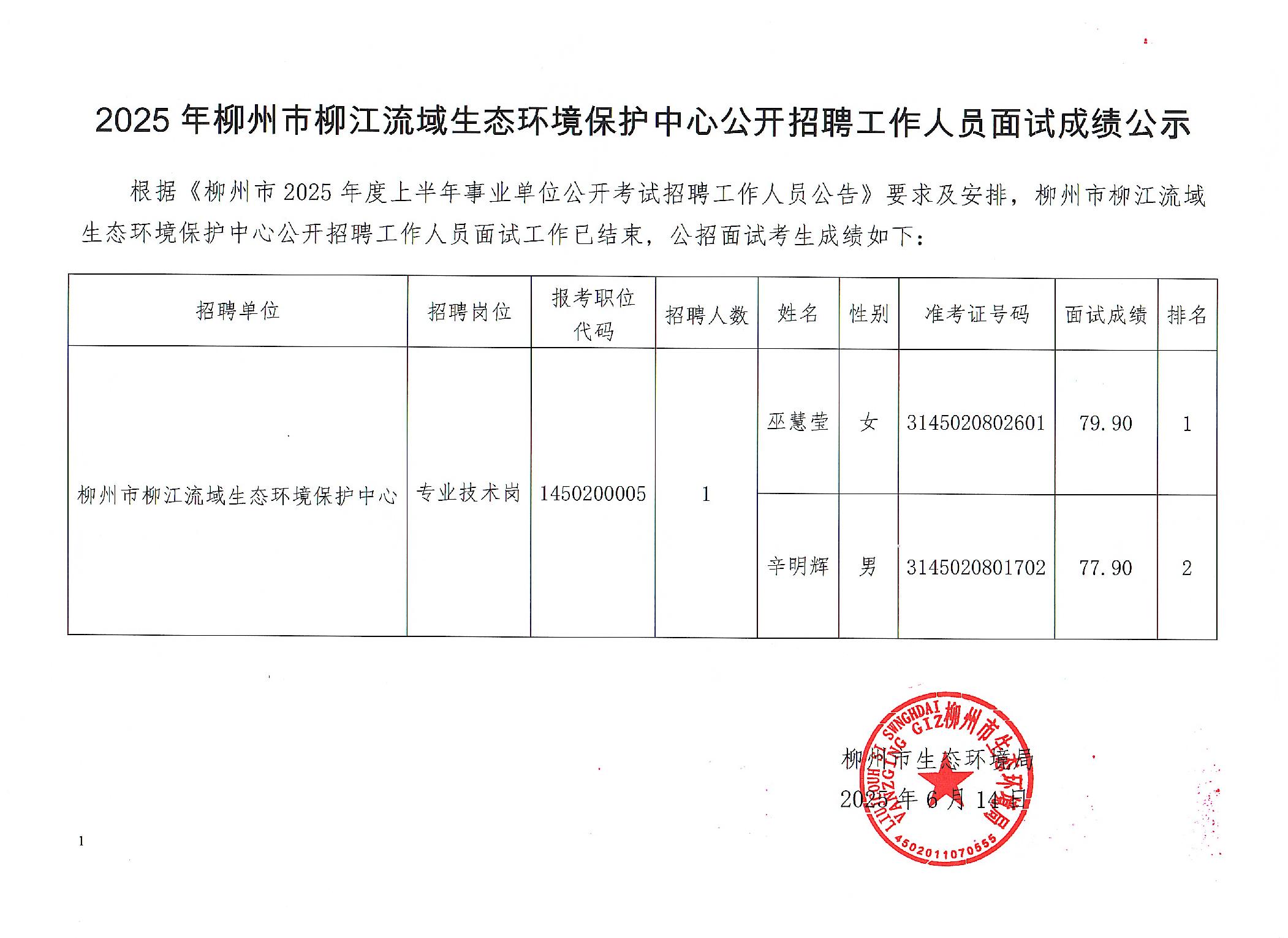 2025年柳州市柳江流域生態(tài)環(huán)境保護中心公開招聘工作人員面試成績公示