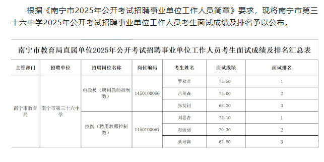南寧市教育局關(guān)于公布南寧市第三十六中學(xué)2025年公開考試招聘事業(yè)單位工作人員考生面試成績及排名的公告