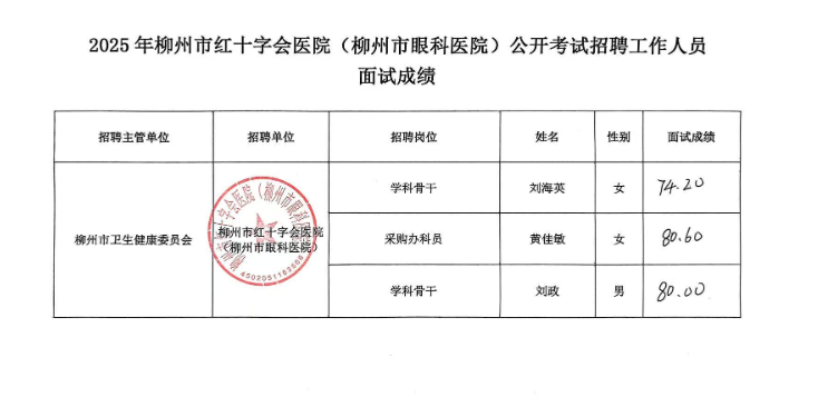 根據(jù)《2025年度柳州市紅十字會醫(yī)院(柳州市眼科醫(yī)院)公開招聘中高級(急需緊缺)人才(第二批)面試公告》要求及安排,現(xiàn)將面試考生成績公示如下(詳見附表)。