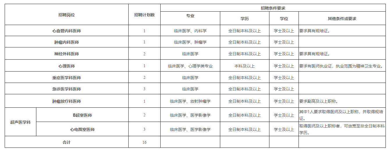 注:初中級(jí)職稱應(yīng)聘人員原則上年齡要求為35周歲及以下;如為副高以上職稱,年齡可放寬至45周歲;學(xué)歷層次高者優(yōu)先。醫(yī)師崗位中如要求具有規(guī)培證條件的是指已取得規(guī)培合格證書(shū)(含通過(guò)規(guī)培結(jié)業(yè)考試未領(lǐng)合格證書(shū))或已取得中級(jí)及以上職稱人員。