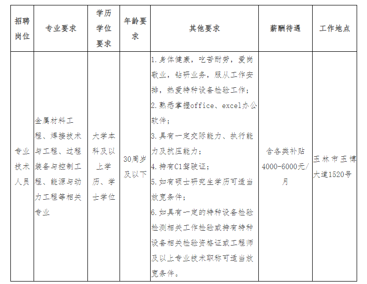 廣西壯族自治區(qū)特種設(shè)備檢驗研究院玉林分院為廣西壯族自治區(qū)特種設(shè)備檢驗研究院下屬分支機構(gòu),根據(jù)業(yè)務(wù)發(fā)展需要,現(xiàn)面向社會公開招聘編外聘用人員1名,崗位需求如下: