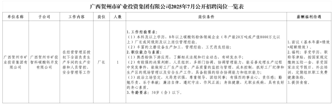 1.廣西賀州市礦業(yè)投資集團(tuán)有限公司2025年7月公開招聘崗位一覽表