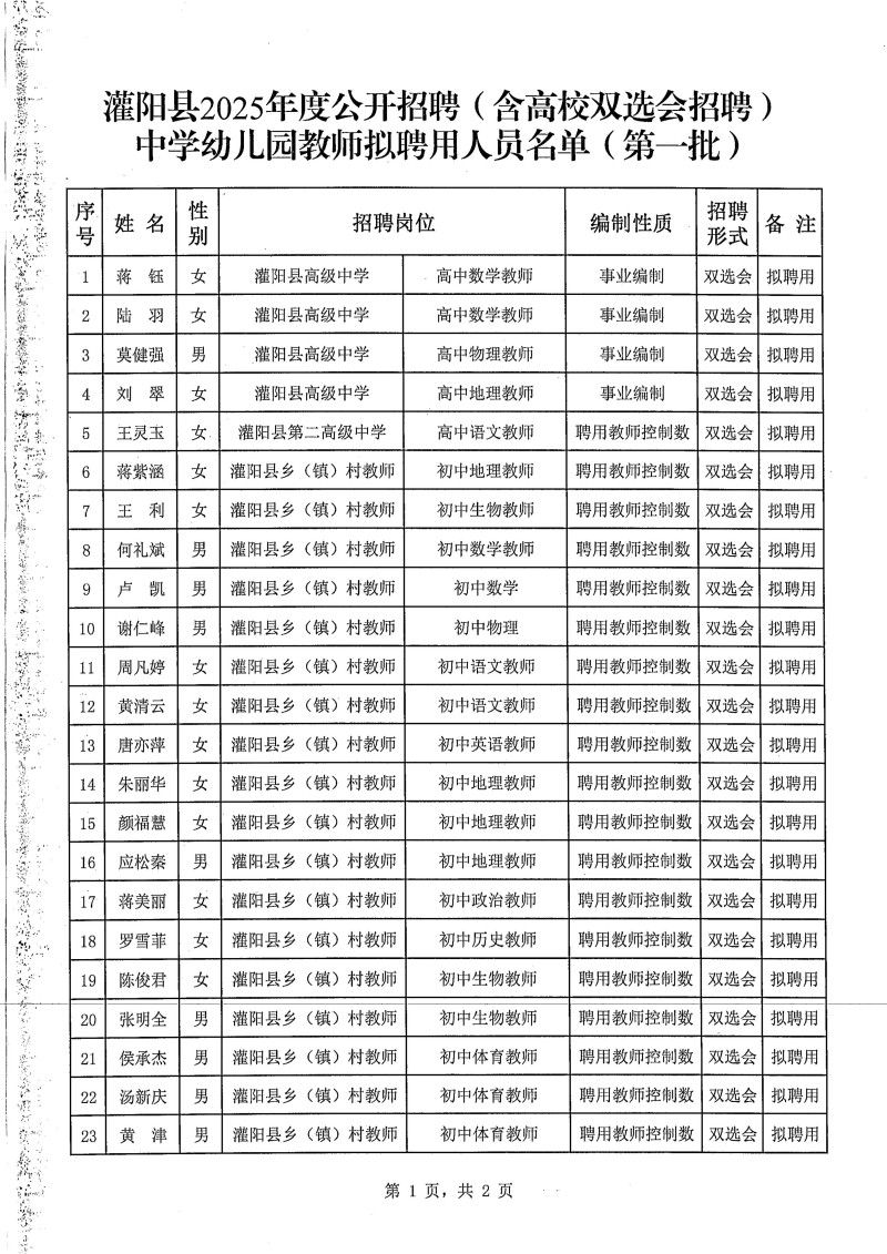 灌陽(yáng)縣2025年公開(kāi)招聘(含高校雙選會(huì)招聘)中學(xué)幼兒園教師擬聘用人員名單(第一批)公示