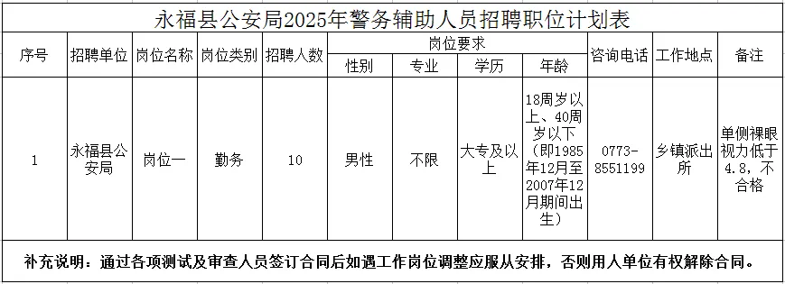 計(jì)劃招聘警務(wù)輔助人員10名。具體崗位、招聘人數(shù)、資格條件詳見(jiàn)《永福縣公安局輔警招聘計(jì)劃表》。