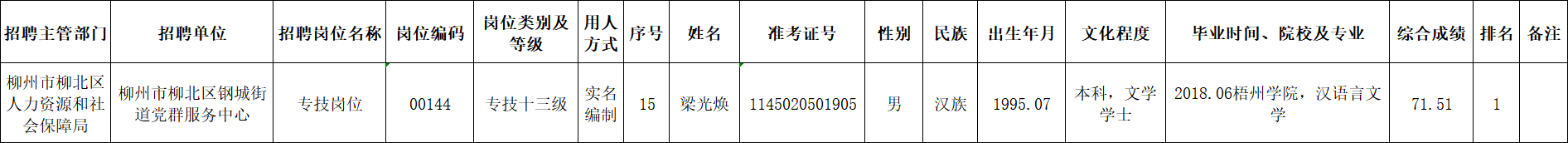 根據《柳州市2025年度下半年事業(yè)單位公開考試招聘工作人員公告》要求及安排,梁光煥同志經面試、考察、體檢合格,符合聘用條件。經研究決定,擬聘用梁光煥同志為我區(qū)事業(yè)單位工作人員,現(xiàn)予以公示,公示期為5個工作日(2026年1月22日至2026年1月28日)。對擬聘用的同志如有異議,請以書面形式,并署真實姓名和聯(lián)系地址,于2026年1月28日前郵寄或直接送我單位(地址:柳州市勝利路12-8號柳北區(qū)政府4樓417室;郵編:545002,電話0772-2513360),群眾如實反映有關問題受法律保護。